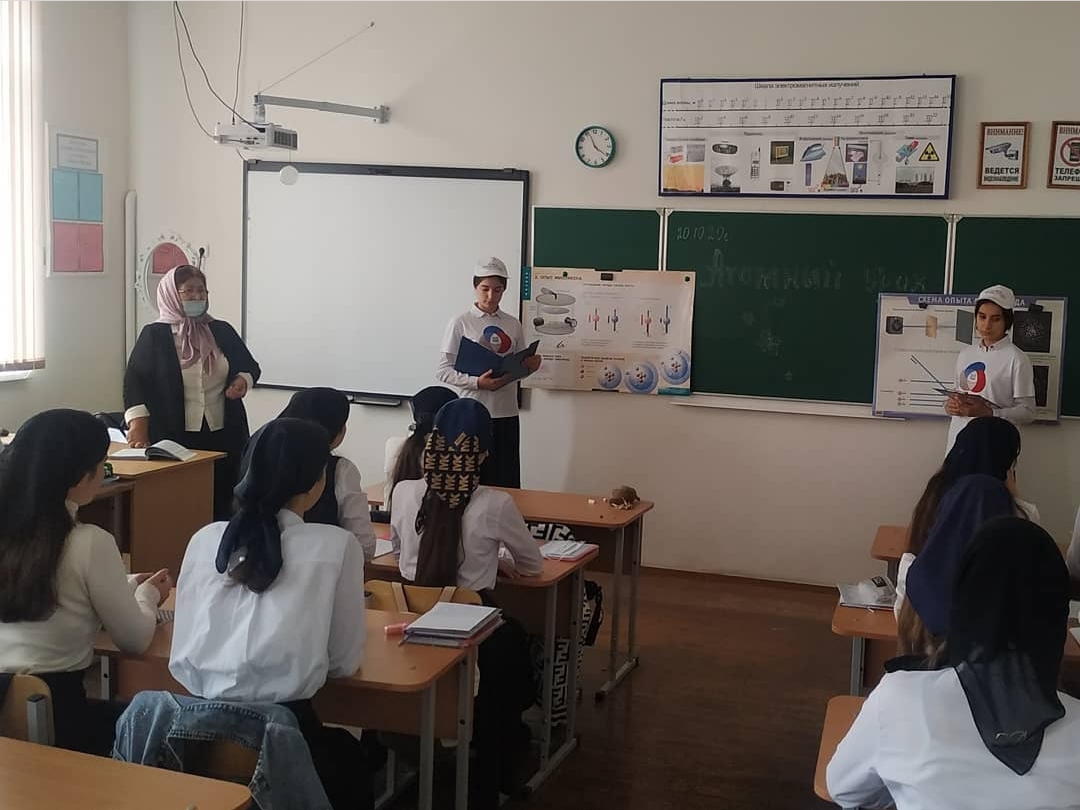 20.10.2020С целью популяризации знаний об атомной отрасли и формирования позитивного отношения обучающихся к атомной промышленности и создания у них стойкого интереса к научным знаниям Петимат Зайндиевна в 9б классе провела открытый урок "Атом и мир вокруг атома". Она объяснила ученикам насколько важно знать, что мир познаваем, что по мере углубления знаний картина мира усложняется. Каждый человек должен представлять, как устроен мир, в котором он живет.