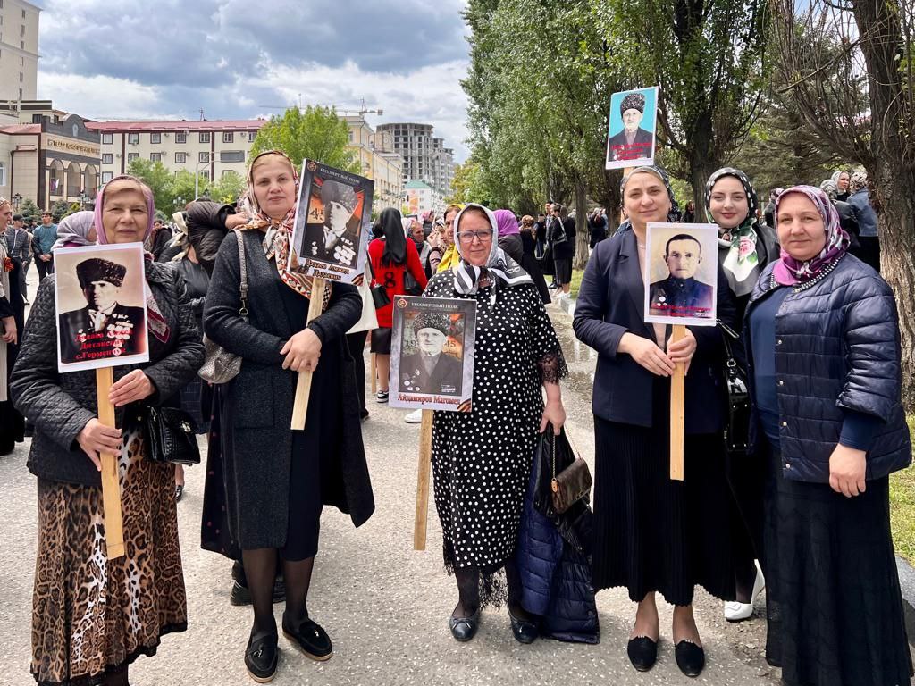 Наши учителя с гордостью несли фотографии ветеранов ВОВ. К сожалению, никого из ветеранов нет в живых. Аллах1 Дала геч дойла царна! "Бессмертный полк" - это общественная акция, инициированная в 2012 году. Это марш, участников которого в День Победы несут транспаранты с фотопортрета участвовавших в Великой Отечественной войне.