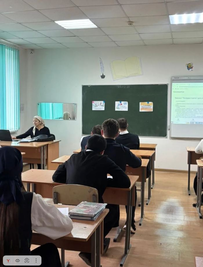 05.12.2025В рамках Недели инвалидов 4 декабря в МБОУ «СОШ №1 г. Шали» в 10 классе педагог-психолог Берсанова П. А. провела тренинг «Толерантность». Она рассказала учащимся о флаге инвалидов, рассказала что такое «толерантный путь» и «интолерантный путь». Далее учащиеся имитировали ситуации, с которыми сталкиваются инвалиды в своей жизни.